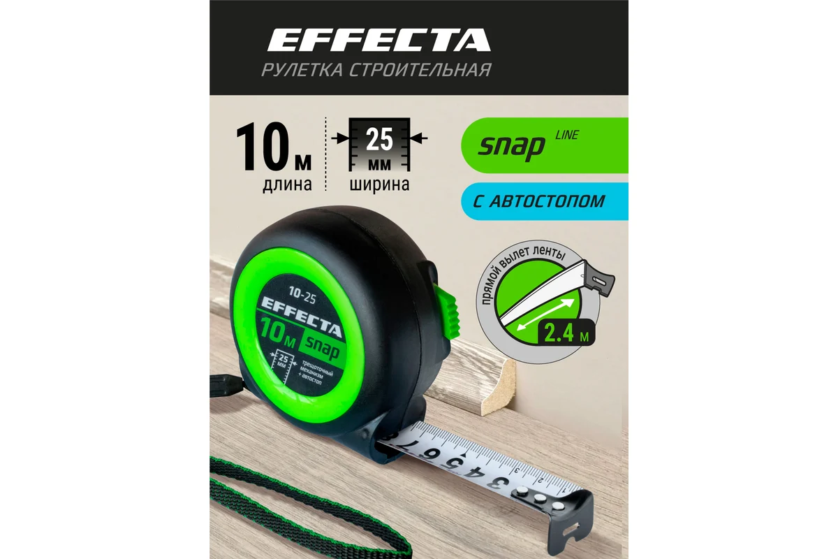 Профессиональная рулетка EFFECTA SNAP — высокоточный измерительный инструмент максимальной длины с системой автостопа. Предназначена для выполнения масштабных строительных и монтажных работ, где требуется большая длина измерения.